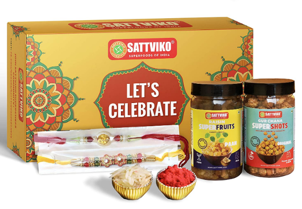 - Sattviko Rakhi Gift Box – 2 Designer Rakhis with Roli + Gur Chana + Paan Raisin