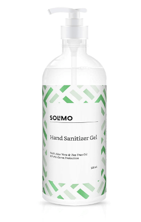 - Amazon Brand – Solimo Hand Sanitizer Gel-75% v/v alcohol-with Aloe Vera & Tea Tree Oil, 500 ml