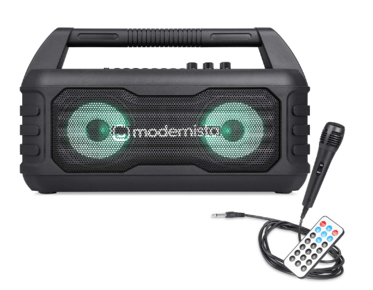 - Modernista Sound-Beast 32 W Portable Bluetooth Outdoor Party Speaker with Karaoke Mic | Multi-Features – Extra Bass, Bluetooth 5.0, FM, USB, Micro SD, Remote | LED Light Modes |Playtime Upto 4 Hrs