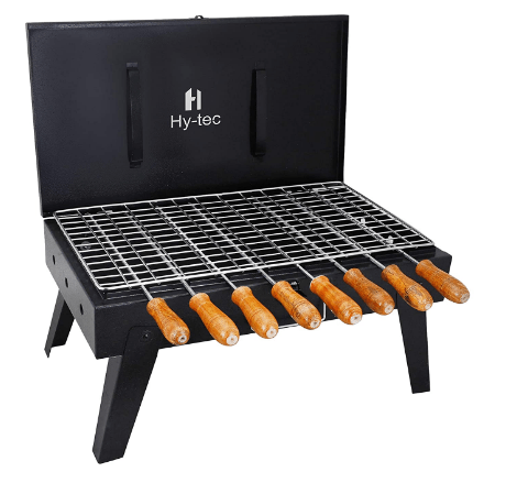 - H Hy-tec (Device) Briefcase Foldable Portable & Picnic Barbeque with 8 Skewers,1 Iron Grill & 1 Packet of Charcoal, Black (Make In India)