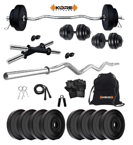 - Kore PVC 16-30 Kg Home Gym Set with One 3 Ft Curl and One Pair Dumbbell Rods with Gym Accessories