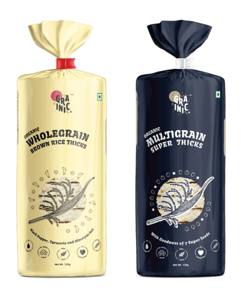 - Grainic Organic Wholegrain Brown Rice Cakes (‘Multigrain’ and ‘Turmeric, Black Pepper and Himalayan Salt’ Combo) (Pack of 2) (18 Cakes/Pack)
