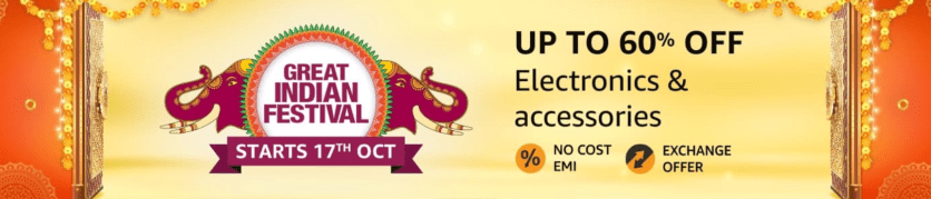 Amazon Great Indian Festival to start from 17th Oct’ 2020. Enjoy big discounts on various products like electronics, clothing, food, mobiles, bags, TVs, refrigerator, daily essentials, speakers and much more.