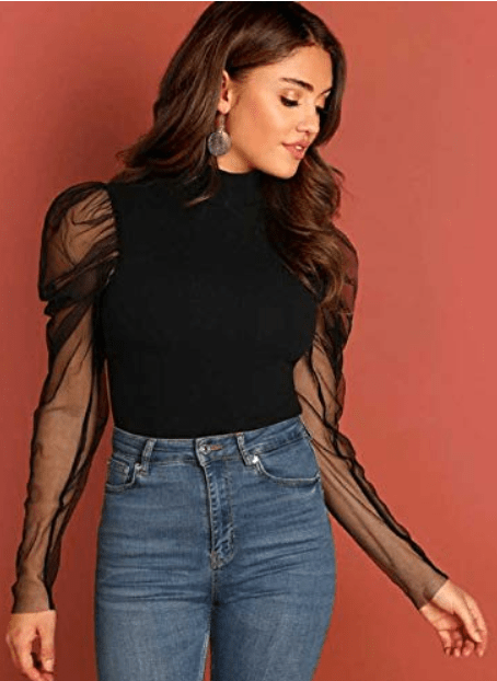 - ZARVEY Casual Juliet Sleeve Solid Women Black Top