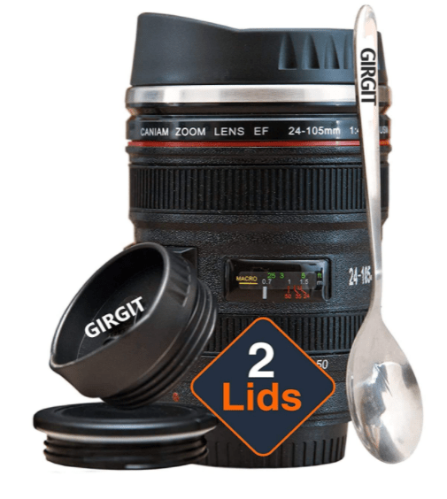 - GIRGIT Camera Lens Mug/Thermos for Coffee with 2 Lid with Spoon, Steel Insulted Camera Lens Coffee Travel Mug/Thermos, Camera Lens Thermos, Travel Thermos Mug, Birthday Gift for Men/Women, Set of (1)