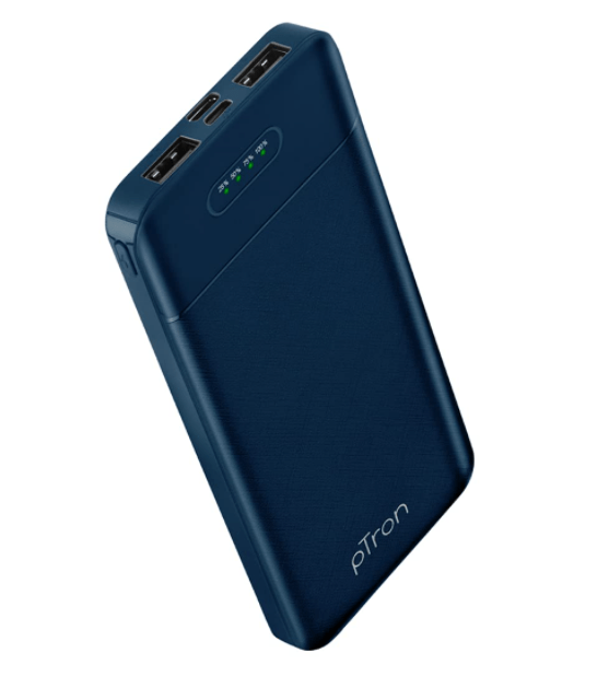 - pTron Dynamo Lite 10000mAh Li-Polymer Power Bank, Made in India, 10W 2.1A Fast Charging Power Bank for Smartphones & Dual USB Ports, Type C & Micro USB Input, Safe & Reliable – (Blue)